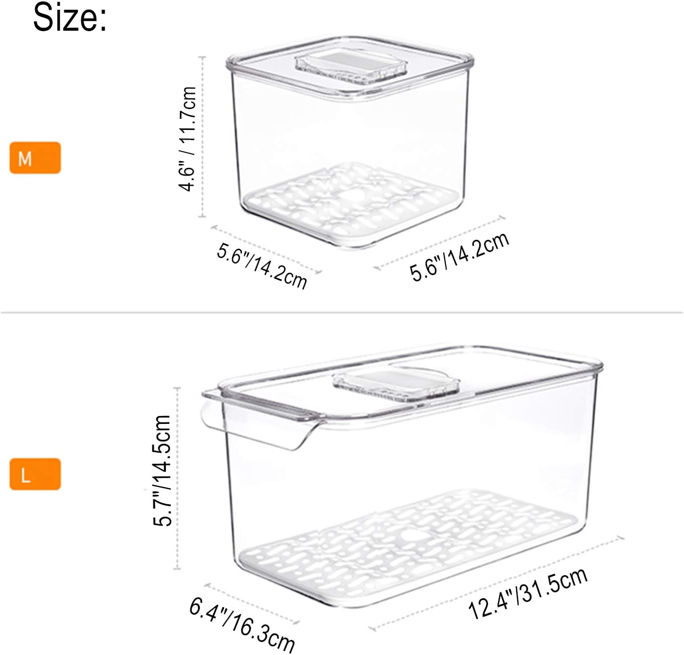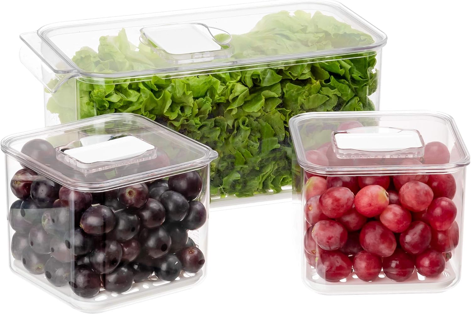 Medium size is perfect for berries, cherry tomatoes, limes, and strawberries; the large container is ideal for storing lettuce, celery, cucumbers, or grapes.