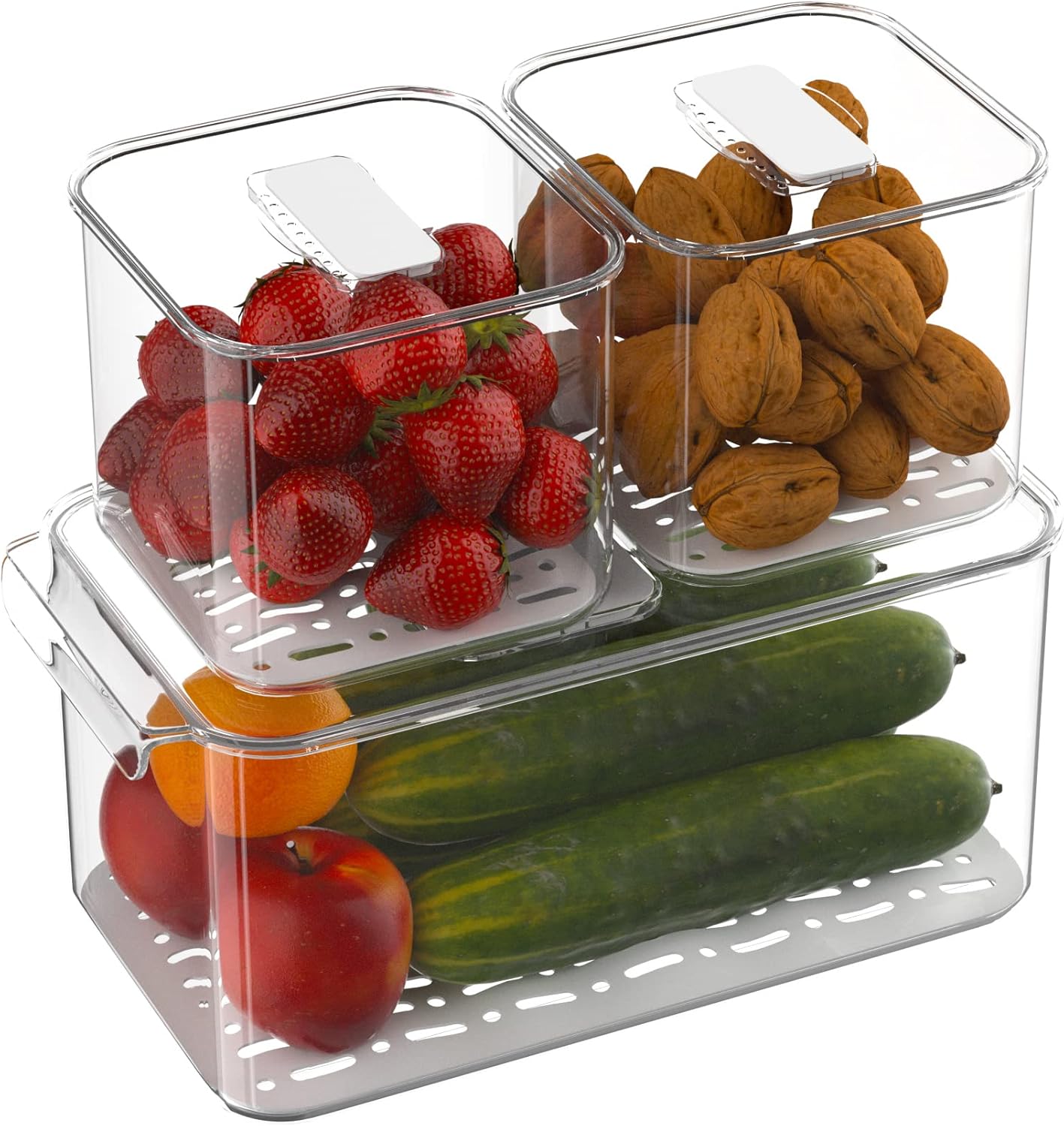 3 Pack Refrigerator Storage Containers with Draining Tray – Fresh-Keeping Boxes for Fruits & Vegetables (2 Medium + 1 Large)